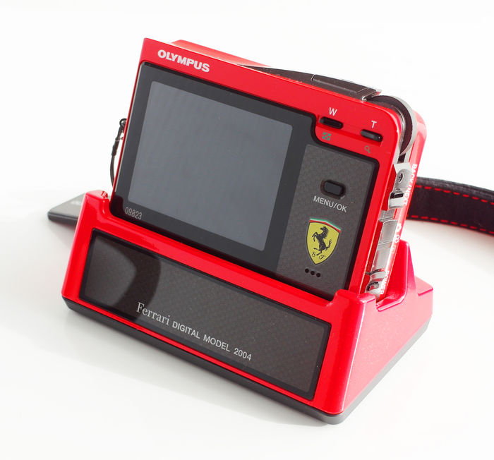 Limitowany Olympus Ferrari DIGITAL MODEL 2004 to bardzo elegancki kompakt z 2.5-calowym monitorem LCD, oczywiście w kolorze czerwonym. Aparat oferuje rozdzielczość 3.2 Megapikseli, aż 18 programów tematycznych oraz 3-krotny zoom optyczny. Zapisane obrazy można oglądać na monitorze LCD, dzięki czemu Ferrari DIGITAL MODEL 2004 może być jednocześnie albumem fotograficznym a znajdująca się w zestawie stacja dokująca, pełnić może rolę podstawki do tej unikatowej przeglądarki zdjęć.
