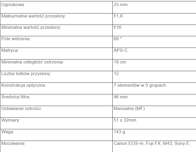 7Artisans 25mm F1.8 to stałoogniskowy obiektyw z funkcją manualnego ustawiania ostrości. Charakteryzuje go kompaktowa, zwarta konstrukcja, niewielki minimalny dystans ostrzenia (18cm) oraz 12-listkowa przysłona odpowiadająca za atrakcyjne dla oka rozmycie tła. Układ optyczny obiektywu składa się z 7 soczewek umieszczonych w 5 grupach. Soczewki zostały pokryte powłokami antyodblaskowymi, które w dużym stopniu redukują odblaski i flary podczas pracy pod ostre światło. Obudowa obiektywu w znacznej mierze została wykonana z aluminium, dzięki czemu obiektyw waży jedynie 150 g. 7Artisans 25mm F1.8 współpracuje z szeroką gamą aparatów bezlusterkowych Canon, FujiFilm, oraz Sony, włączając w to najnowsze modele: Canon M6 i M10, FujiFilm X-T2 oraz Sony A7II, A7RII czy A7SII.