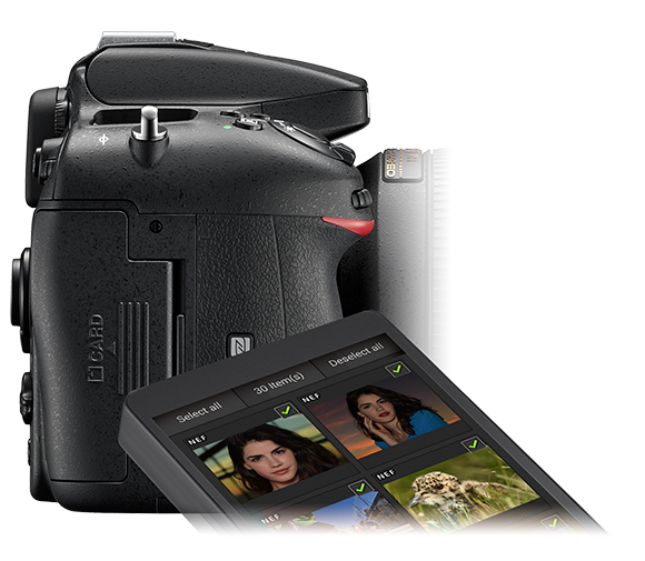 Obsługa technologii NFC: łatwe przesyłanie zdjęć do urządzenia inteligentnego z funkcją NFC. Wystarczy zetknąć aparat D7200 z urządzeniem inteligentnym, aby przesłać zdjęcie wyświetlane na ekranie LCD aparatu.